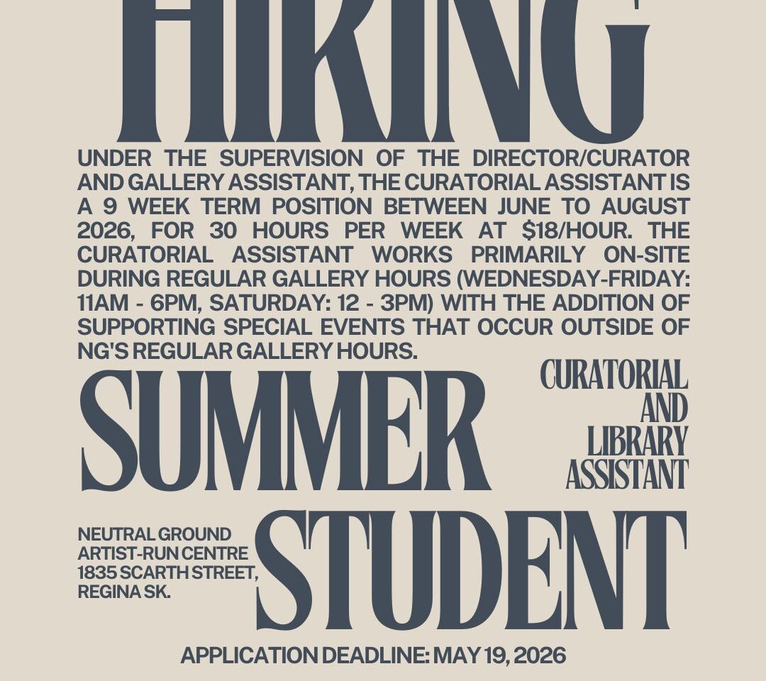Under the supervision of the Director/Curator and Gallery Assistant, the Curatorial Assistant is a 9 week term position between June to August 2026, for 30 hours per week at $18/hour. The Curatorial Assistant works primarily on-site (Neutral Ground is located at 1835 Scarth Street, Regina SK) during regular gallery hours (Wednesday-Friday: 11am – 6pm, Saturday: 12-3pm) with the addition of supporting special events that occur outside of NG’s regular gallery hours.